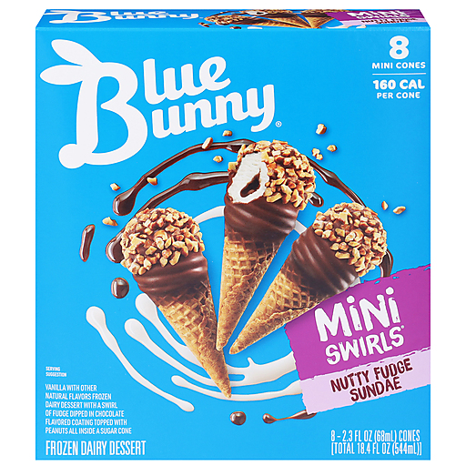 Seize the swirl with Blue Bunny Mini Swirls Nutty Fudge Sundae Cones, the sweet and salty frozen treats that offer big flavor in a convenient snack-sized cone. A swirl of vanilla-flavored frozen dairy dessert with a fudge center gets dipped in chocolatey coating and covered in peanut pieces—all inside a crunchy sugar cone. The dipped swirly cue and bonus chocolaty bite at the bottom make these frozen sweet treats fun to eat from top to bottom. High-quality ingredients go into every batch of Blue Bunny, so grab life by the cone! Use Mini Swirls as frozen treats at backyard parties or as perfectly sized sweet snacks the whole family can enjoy. You can even treat yourself and others to these frozen snacks as a way to commemorate hitting personal milestones or for celebrating birthdays. These individual snacks make it easy to stock up on frozen desserts. Try every single delicious, unique Blue Bunny frozen dessert, including Twist Cones that offer a new take on the soft serve experience. Blue Bunny—We Make Fun.