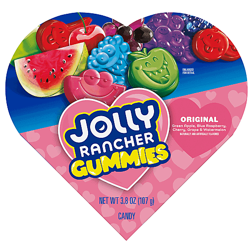A mix of five fruity favorites in just one stunning heart shaped gift box filled with chewy gummies? You wouldn't have thought it possible if you didn't know JOLLY RANCHER candy. This Valentine's Day box of fruit flavored gummies is full of fun, flavorful fruit shapes just about anyone would be happy to choose from. Featuring blue raspberry, green apple, cherry, grape and watermelon flavors, JOLLY RANCHER gummies offer a combination of the undisputed original flavor classics you already know and love. Keep this box with you on the go so you can share with friends, co-workers and family members throughout the day — but don't forget to save some gummies for yourself during all that sharing! These fruit flavored candies make the perfect Valentine's Day display or gift thanks to their themed, heart shaped box and delicious fruity flavors. Give this box of candy to the one you love with a card and a bouquet of flowers for a thoughtful gift this Valentine's Day. If you want a small, chewy candy with a big taste to keep your taste buds busy during movie nights, lunch hours and snack breaks or show your loved ones how much you care during the season of love, JOLLY RANCHER chewy gummies are the treat for you.